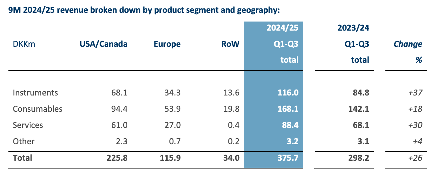 Fast forward to the most recent quarter, Q3 2024/25, and the picture has dramatically improved. As the funding environment stabilized, pent-up demand was unleashed. The company reported a stunning 26% year-over-year revenue growth to DKK 124.2 million, with an incredible EBITDA margin of 51%. Instrument sales roared back, growing 23%, while the underlying engine continued to hum, with consumables growing 18% and services an impressive 47%.