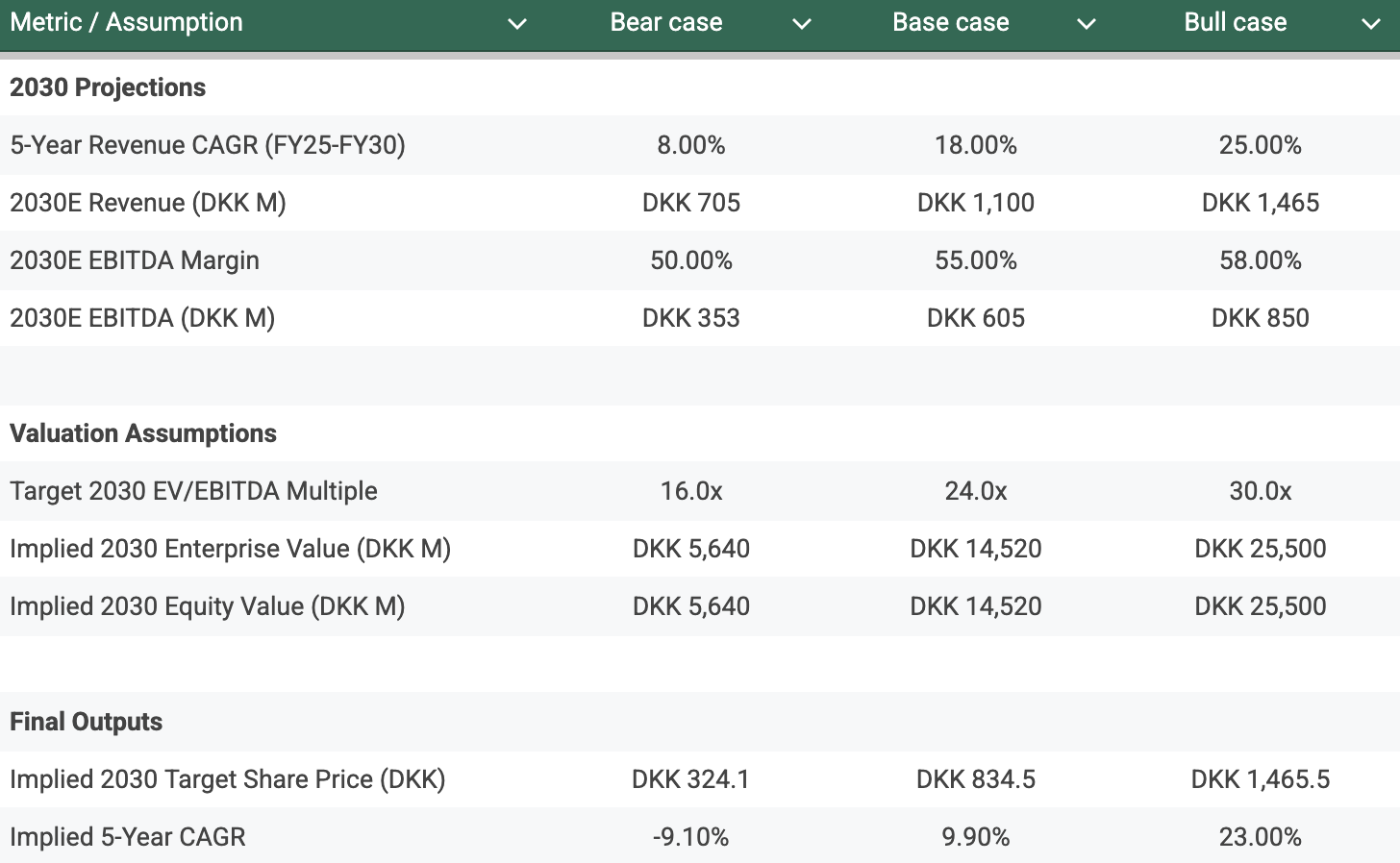 The following table synthesizes my financial projections and valuation analysis for each scenario, culminating in a target share price for mid-2030 and the implied 5-year CAGR from the current share price of DKK 519.