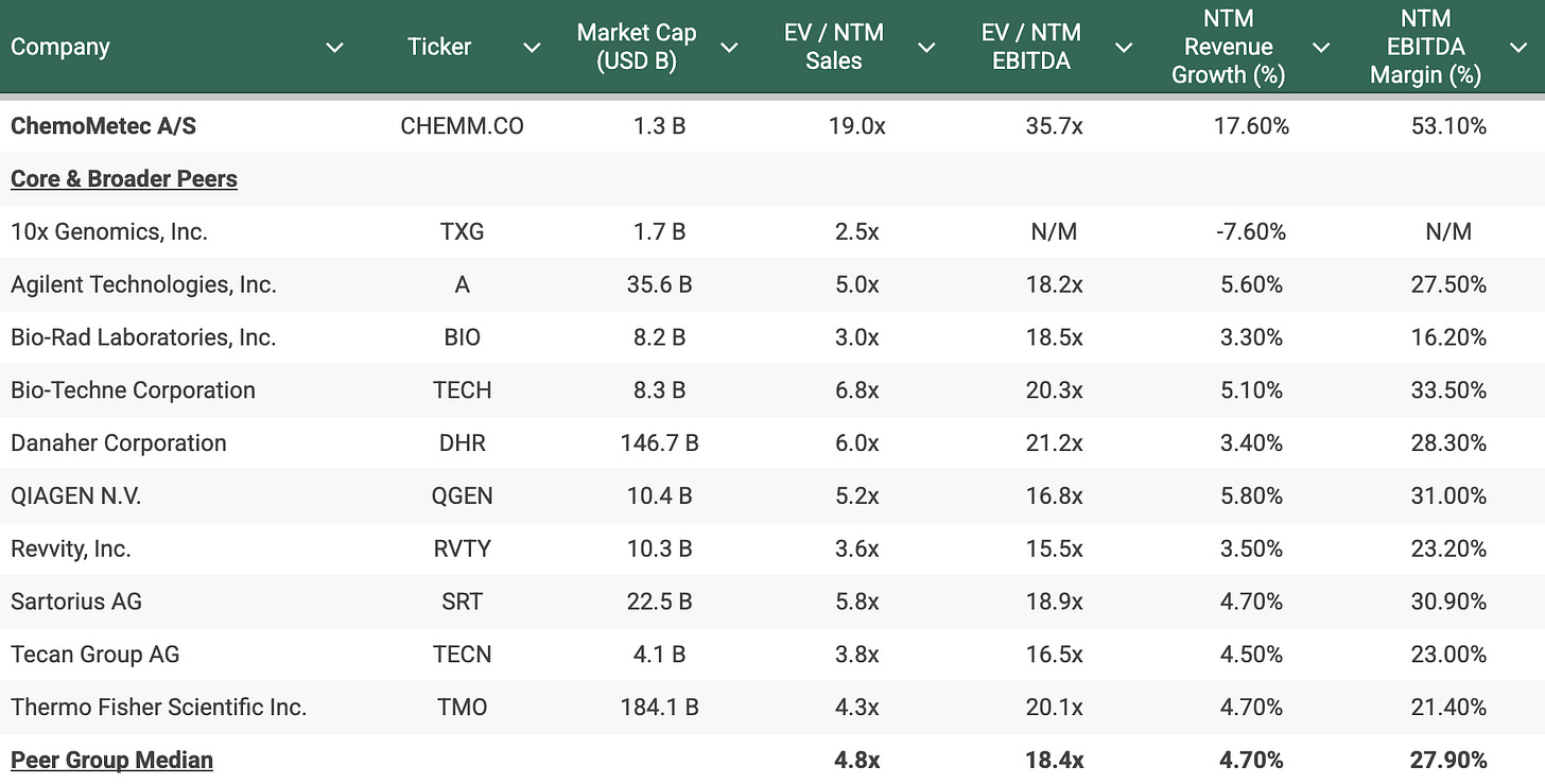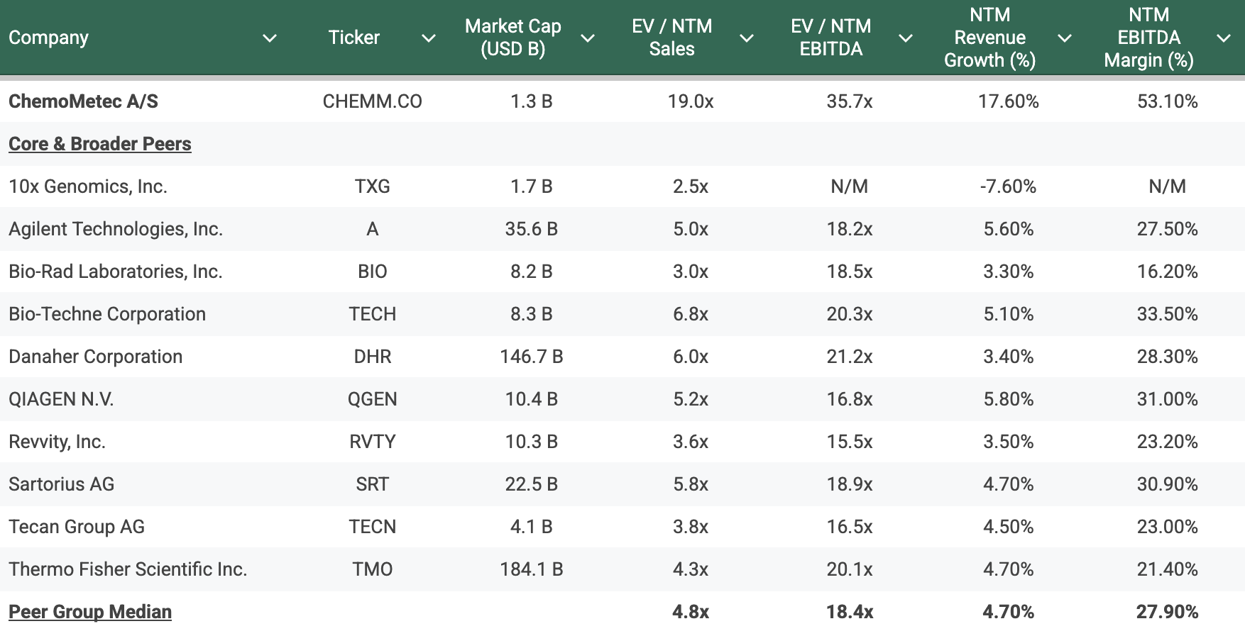 Note: Data as of September 3, 2025. ChemoMetec figures based on FY25 guidance. Peer data based on consensus estimates and latest available financial data. NTM (Next Twelve Months) is used where available; TTM (Trailing Twelve Months) or next fiscal year estimates are used as proxies otherwise.