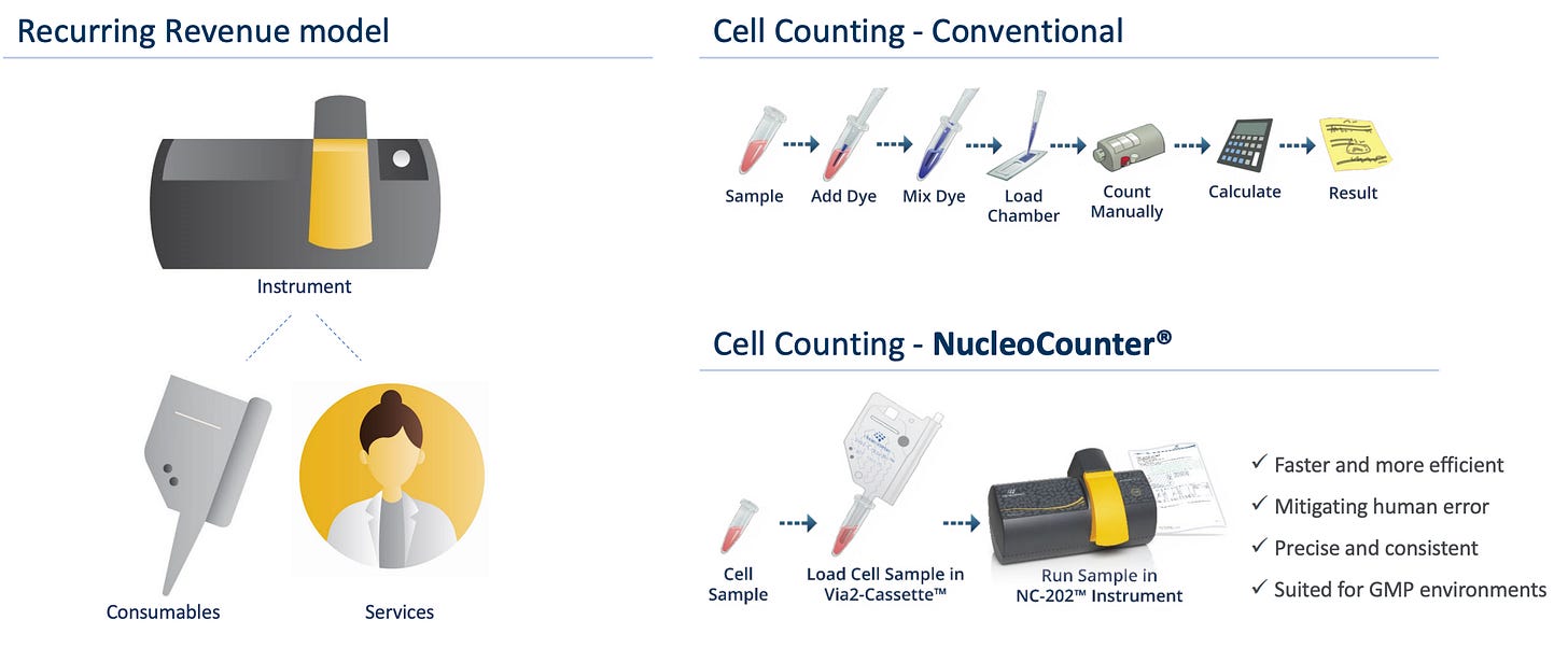 The "Machine": ChemoMetec develops and sells a range of proprietary, automated cell counters. Their flagship products have been the NucleoCounter® series, like the workhorse NC-202™, and they are now rolling out the next-generation XcytoMatic® platform for higher-throughput applications (albeit facing tough competition in this segment). These instruments are the "Nespresso machines". They are sophisticated, reliable, easy to use, and represent the initial sale to a customer.