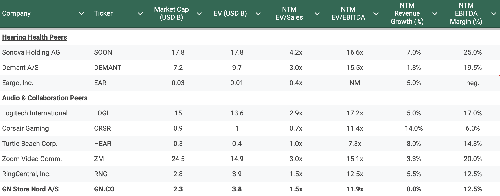 The following table grounds the valuation in current market realities. It visually demonstrates the valuation premium of Hearing Health peers over most Audio & Collaboration peers, highlighting the valuation disconnect I believe exists for GN.