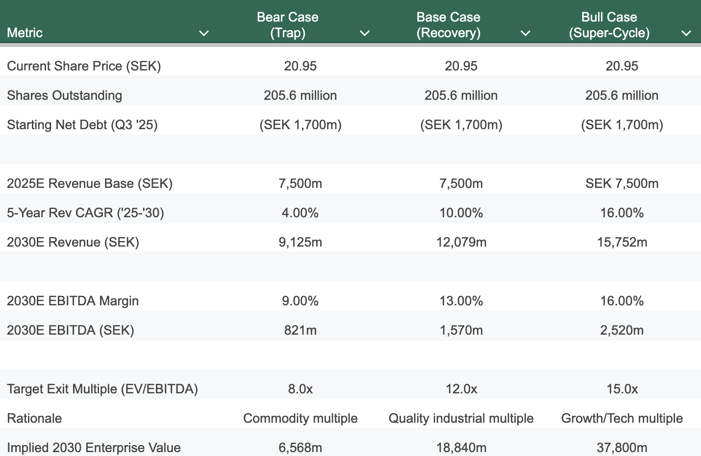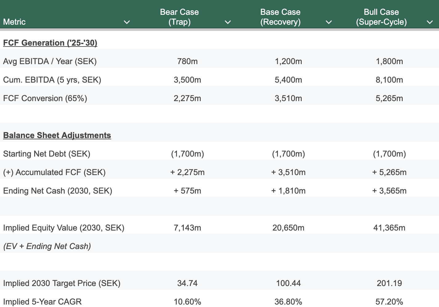🎯 Target Price (Base Case): SEK 100 by End of 2030.