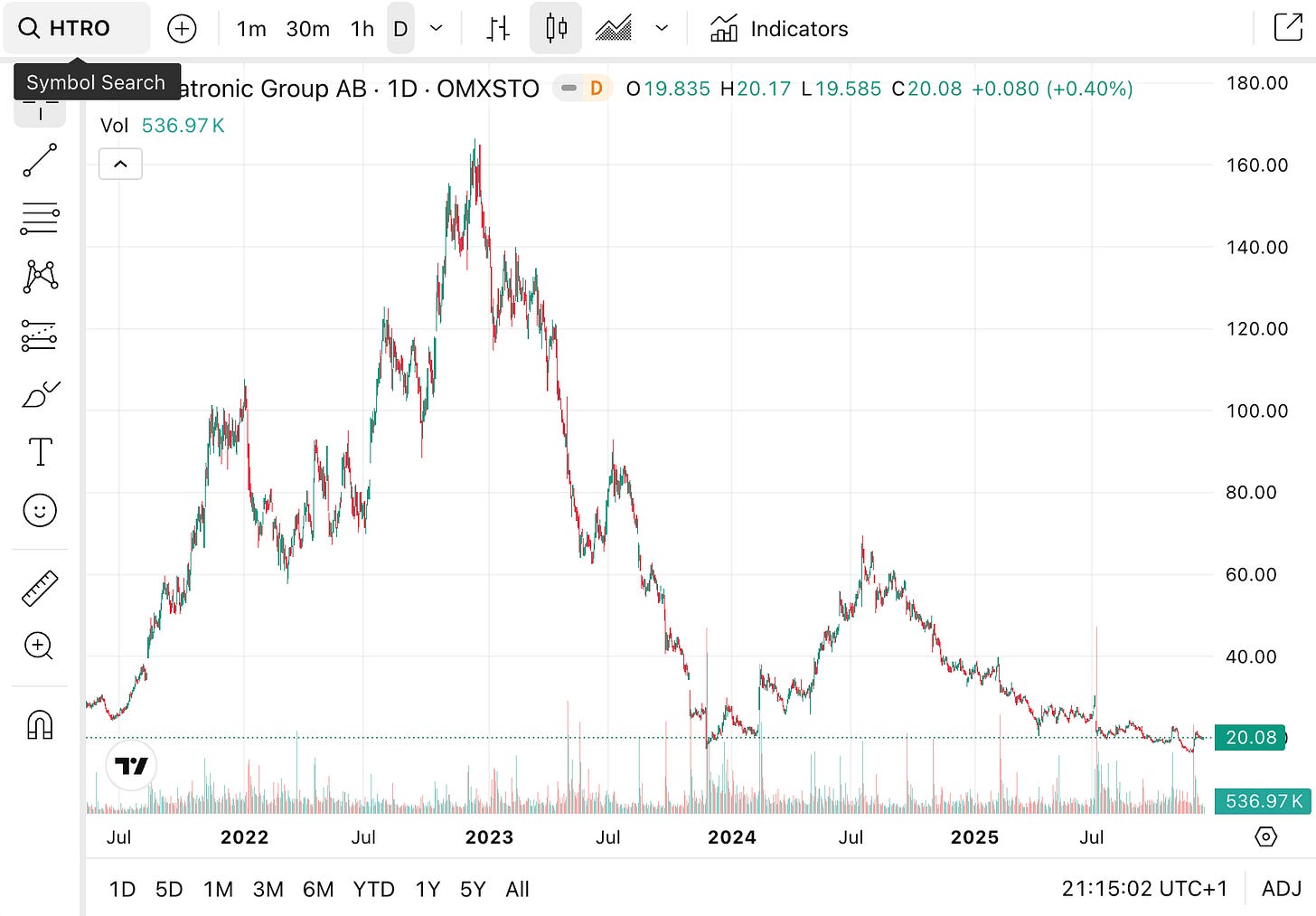 From highs above SEK 160 in late 2022/early 2023, Hexatronic now trades around SEK 21, i.e. a 90% drawdown. The combination of restructuring noise, uncertain US timing and a broken chart has pushed the stock into the “too hard” bucket for most investors. Yet Q3’s +2% organic growth suggests the patient is stabilising, and the “kitchen-sink” cost programme should lift margins even without much top-line help.