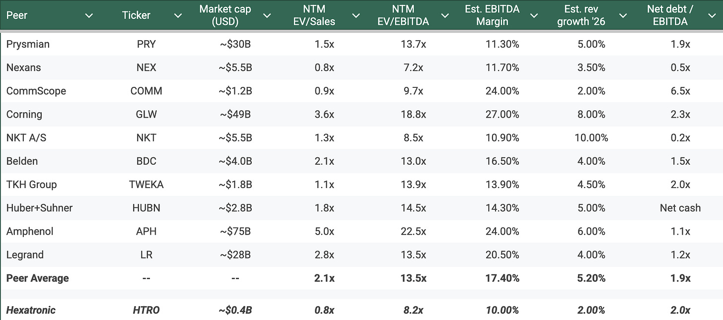 On NTM EV/EBITDA, these peers cluster around 12–14x, with distressed and commoditised names at 7–9x and high-quality, data-center-levered businesses in the mid-teens. Hexatronic at ~8.2x is priced closer to the distressed and commoditised end of this spectrum, despite having growth and balance sheet characteristics that fit much better with the solutions group.