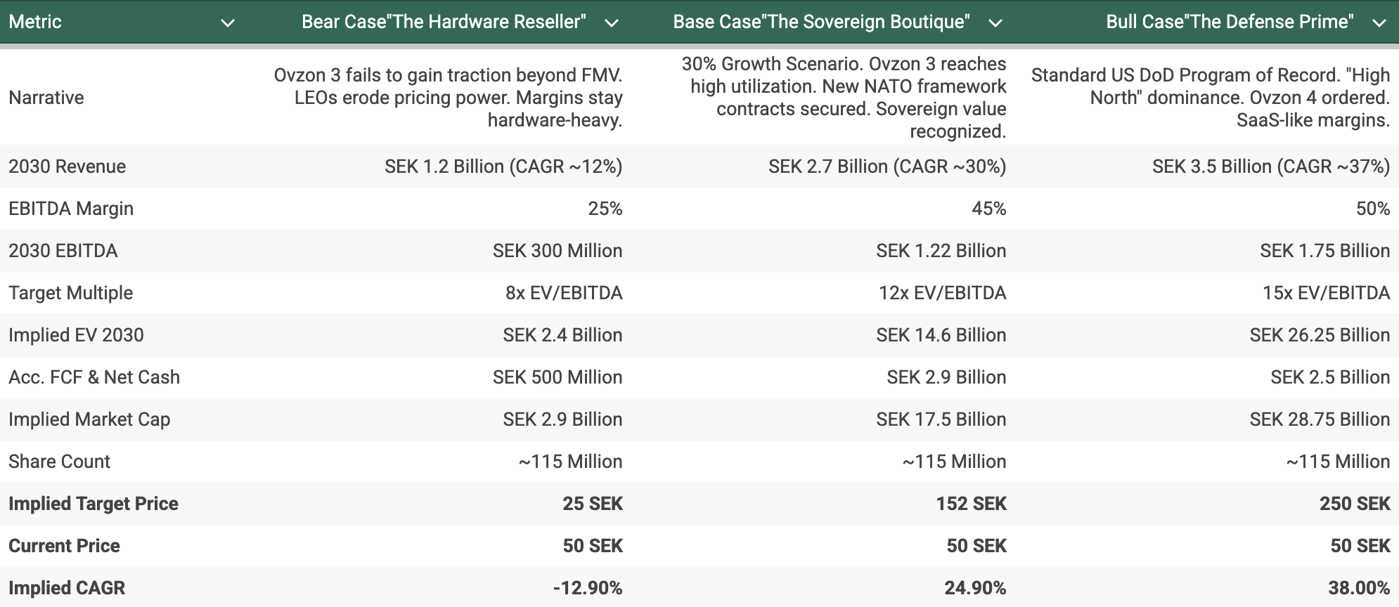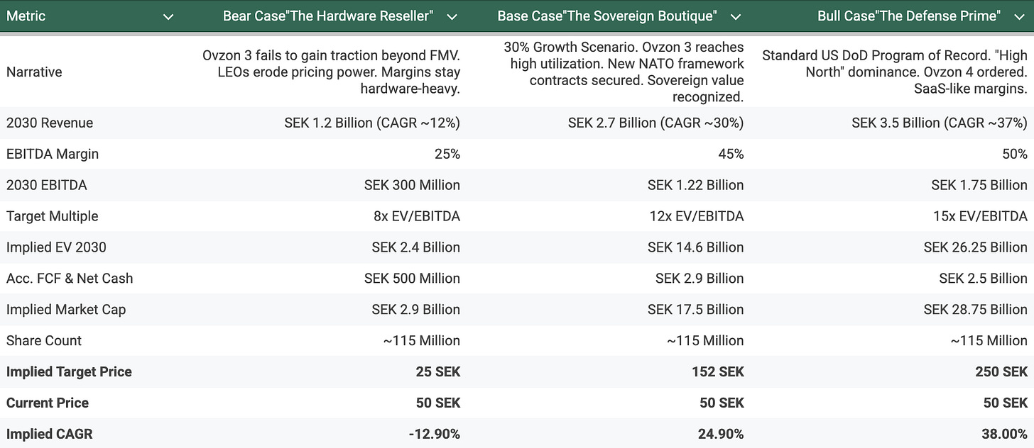 Risks: While the upside is clear, this remains a binary bet on hardware. The company relies entirely on Ovzon 3. If that satellite fails, the business model breaks. Additionally, the long-term threat of SpaceX’s Starshield encroaching on this niche is real. For a full breakdown of the risks, please refer to the Pre-Mortem chapter immediately following this section.