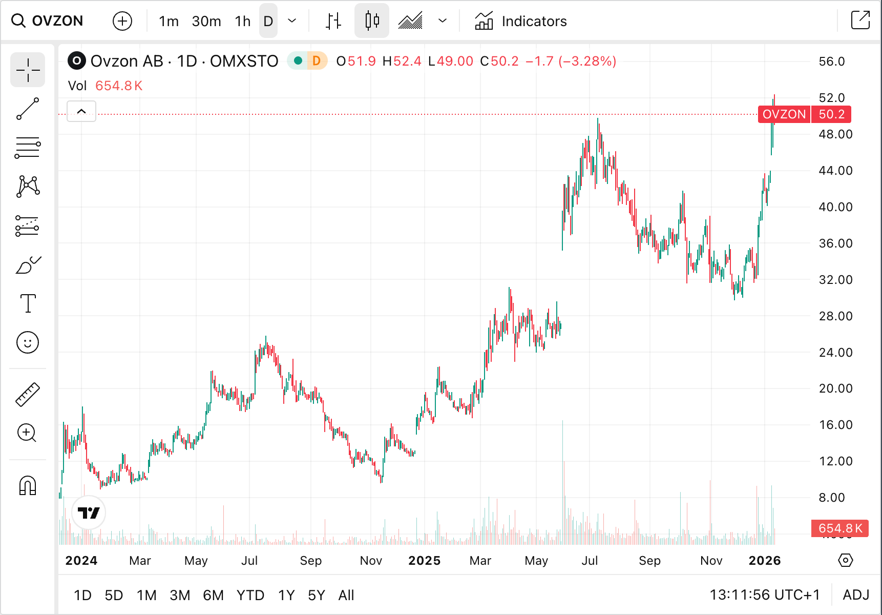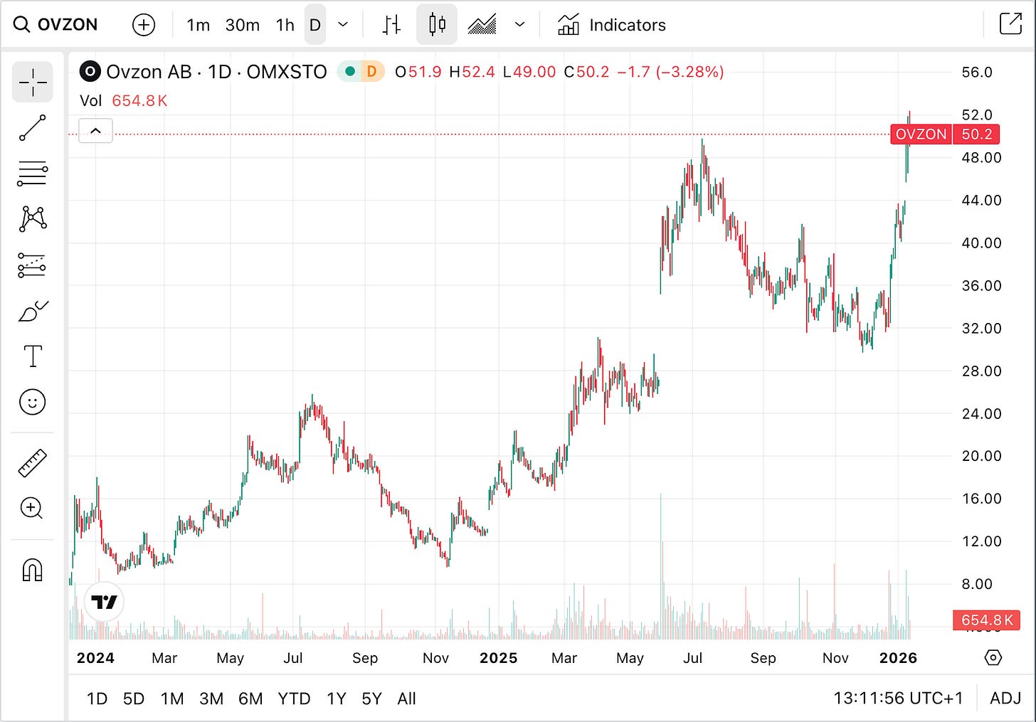 As of January 2026, the stock is trading near 50 SEK, marking a return of roughly 200% over the last year.