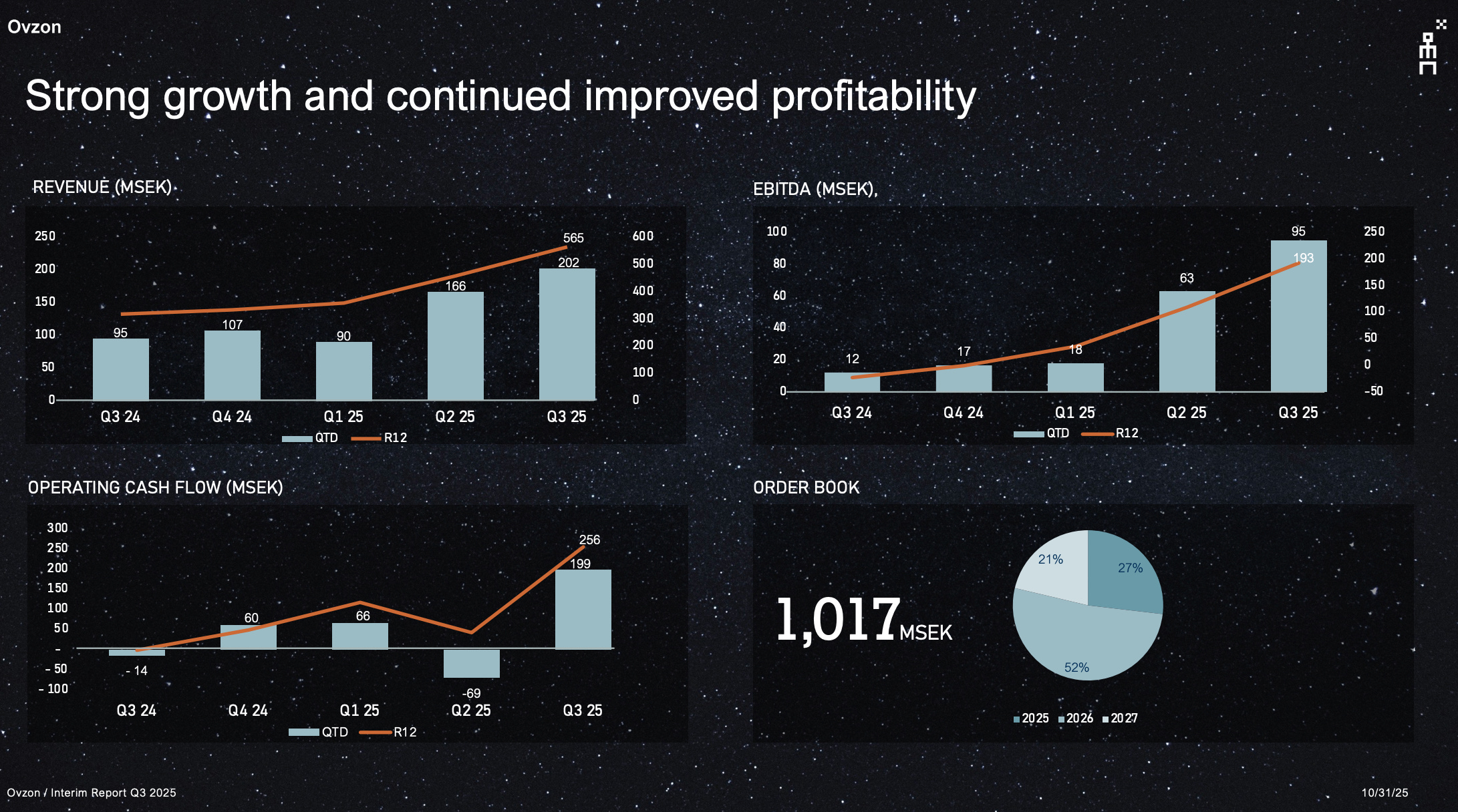 Revenue Growth: Revenue in Q3 2025 reached 202 MSEK, a significant increase from the 95 MSEK reported in the first quarter. This represents growth of 113% year over year. This surge is the direct result of the large Swedish Defence contract and the operational activation of Ovzon 3.