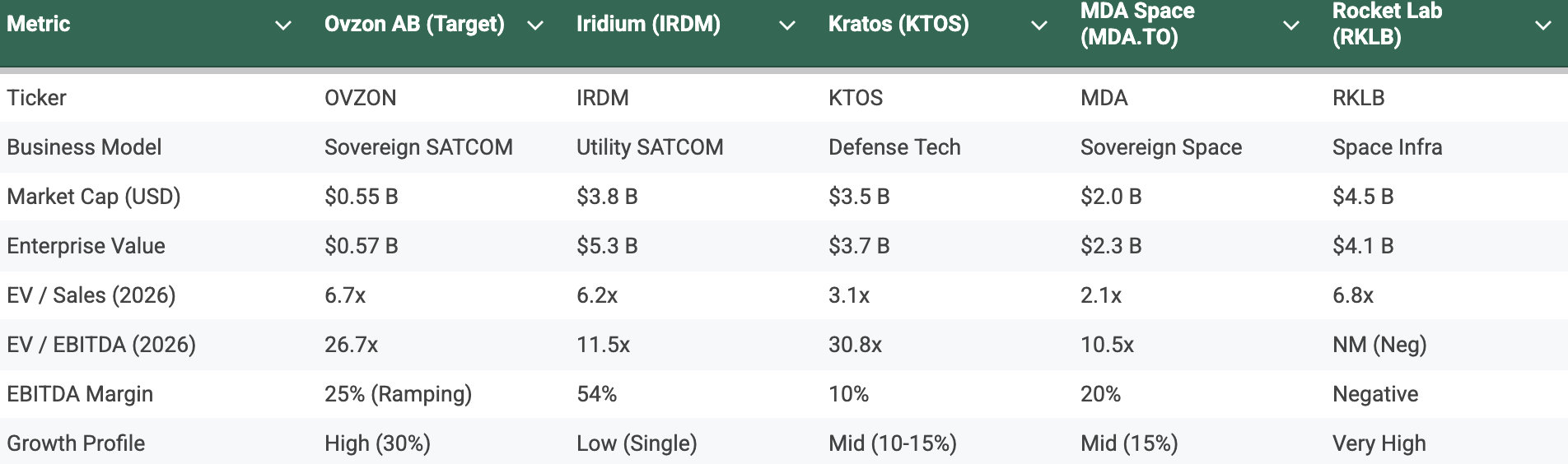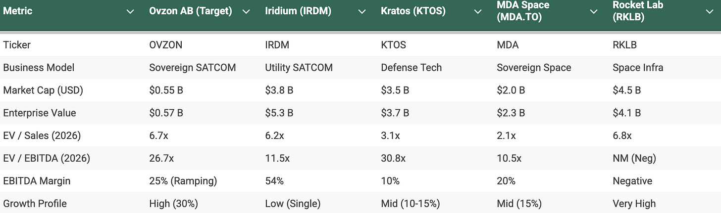 To ensure the peer group reinforces the high-margin / critical infrastructure thesis, I have been strict in our selection. I have removed distressed legacy operators (like EchoStar) and commercial broadband commodity players (like Viasat) to focus exclusively on Sovereign Space and Defense Tech peers. These are the companies that, like Ovzon, command a premium for proprietary technology and government-hardened infrastructure.