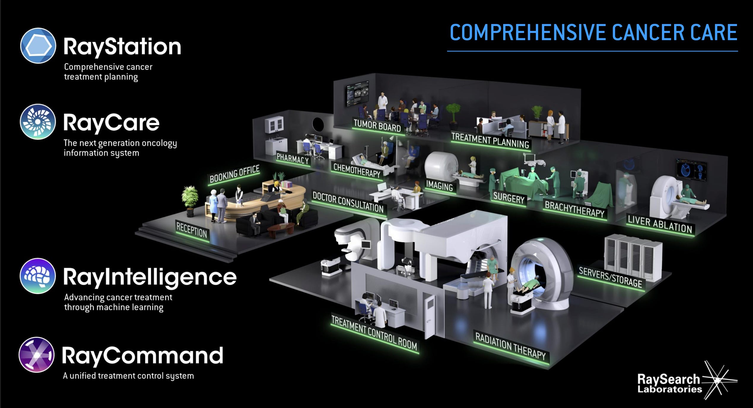 RaySearch’s strategic logic is to leave the machine in place, replace everything above it. Decouple the clinic’s intelligence layer from the incumbent hardware stack. There are four key products in the ecosystem; RayStation, RayCare, RayCommand and RayIntelligence.